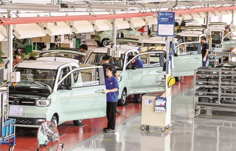 在上汽通用五菱宝骏基地,一辆辆柳产新能源汽车通过组装走下生产线。(全媒体记者 覃科 摄)