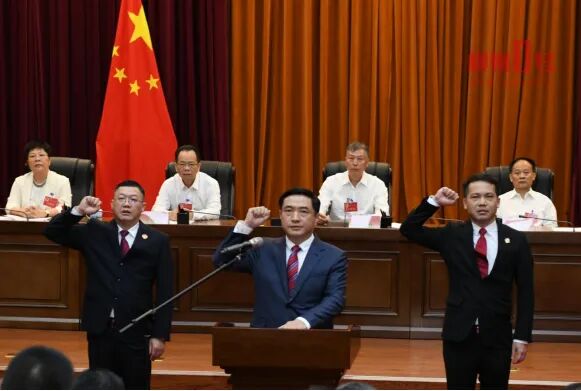 刘传林为傅晓明、方雷颁发任命书。刘胜友、傅晓明、方雷向宪法宣誓。