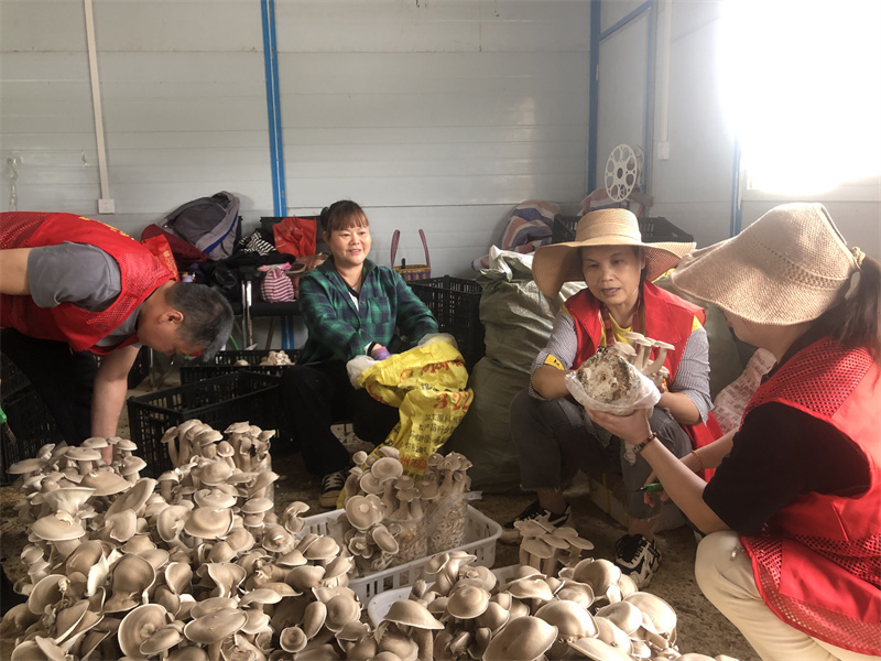 2024年4月1日,白露街道小村村村民在珍稀菌种种植基地采摘鹿茸菇