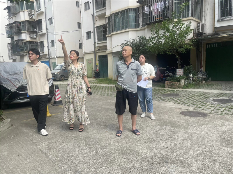 2025年7月15日,雀儿山街道南雀社区党委书记、柳北区人大代表韦英协调三无小区房顶漏水问题。