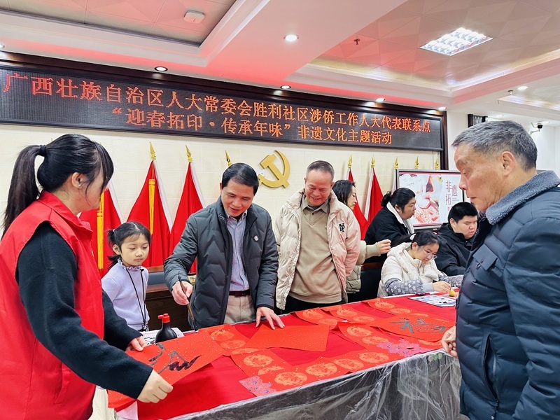 新春将至,年味渐浓。为弘扬中华优秀传统文化,丰富归侨侨眷及其青少年的节日文化生活,营造欢乐祥和、温馨团结的节庆氛围,2月12日上午,广西壮族自治区人大常委会胜利社区涉侨工作人大代表联系点联合胜利社区团支部共同开展了“迎春拓印·传承年味”非遗文化主题活动。邀请联系点驻点人大代表、社区团支部成员与社区归侨侨眷、侨界青少年欢聚一堂,共同体验传统技艺,喜迎新春佳节。