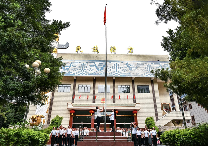 9月30日,在国庆节来临前,融水苗族自治县人大常委会机关等单位在县人大机关所在地——民族会务中心国旗台前举行升国旗仪式,庆祝中华人民共和国成立76周年。自治县人大常委会机关、自然规划局、机关后勤服务中心干部职工参加升国旗仪式。早上8:30,在雄壮的国歌声中,全体人员庄严肃立,向冉冉升起的国旗行注目礼,表达对祖国的深深祝福。