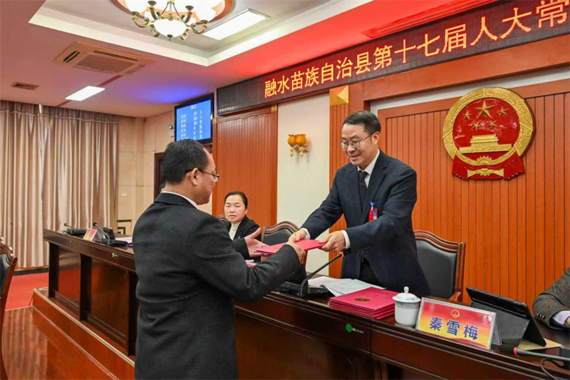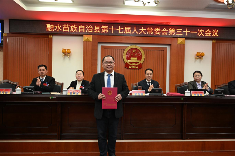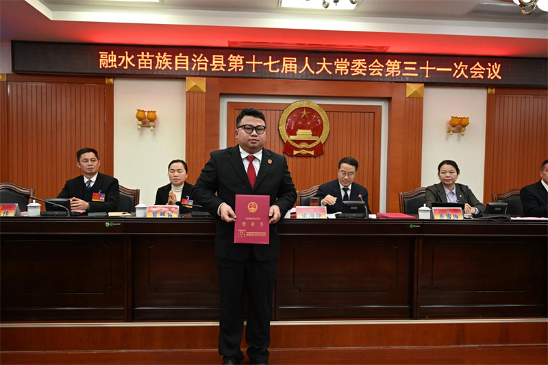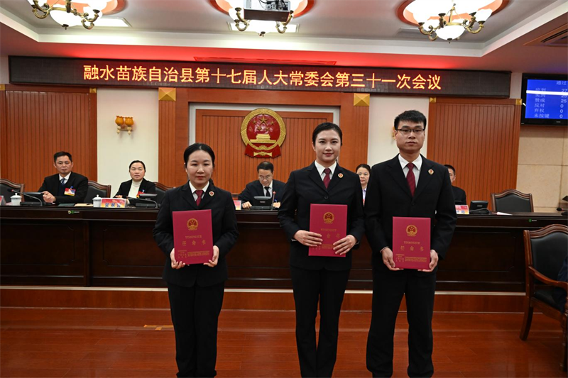 会议审议了人事任免事项,决定免去梁太坚的融水苗族自治县林业局局长职务,免去黄晓东的融水苗族自治县人民法院审判员、审判委员会委员职务,免去杨照锋的融水苗族自治县人民检察院检察委员会委员职务,免去韦新跃的融水苗族自治县人民检察院检察员职务;决定任命梁太坚为融水苗族自治县自然资源和规划局局长,任命潘家富为融水苗族自治县人民法院审判员,任命覃梁认、卢娜、覃小圆为融水苗族自治县人民检察院检察委员会委员,自治县人大常委会主任梁海静为新任职人员颁发任命书。