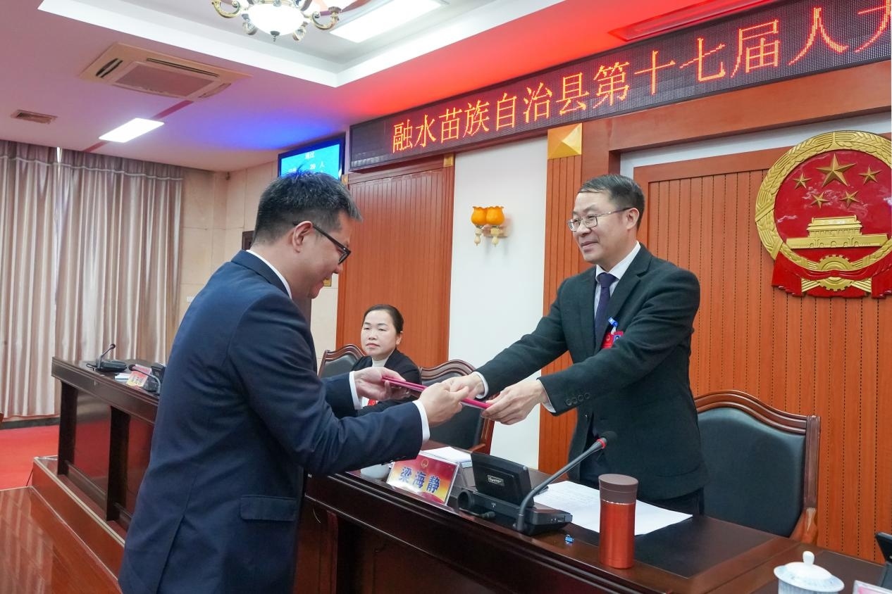 会议审议了人事任免事项,决定免去袁源的融水苗族自治县人民政府副县长职务,决定任命万海东为融水苗族自治县人民政府副县长,自治县人大常委会主任梁海静为新任职人员颁发任命书。新任职人员在会上进行了宪法宣誓。