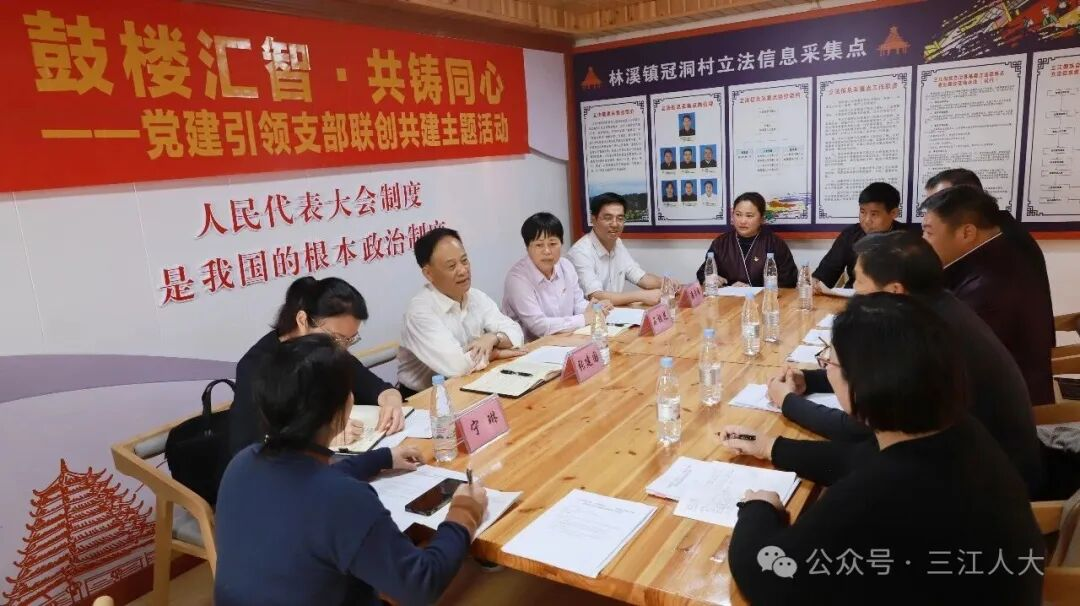 市人大机关第二党支部、三江县人大机关党支部、林溪镇冠洞村党总支部构建市、县、村三级联动共建机制,确定以共学共研互促,联合开展法治思想学习专题教育;以共商共议破题,梳理基层治理难点问题;以共用共通渠道,推动党的创新理论、法律法规、惠民政策飞入寻常百姓家;以共创共建载体,动态优化服务供给与品牌建设。