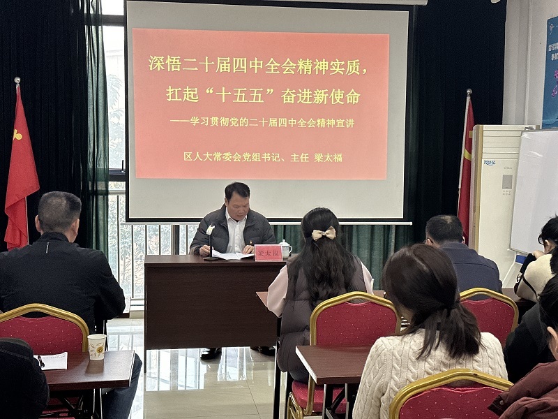 为深入学习贯彻党的二十届四中全会精神,准确理解把握《中共中央关于制定国民经济和社会发展第十五个五年规划的建议》(以下简称《建议》)的核心要义与战略部署,12月30日下午,鱼峰区人大常委会党组书记、主任梁太福以“深悟党的二十届四中全会精神实质,扛起‘十五五’奋进新使命”为主题,到箭盘山街道窑埠社区宣讲党的二十届四中全会精神。区人大常委会机关党支部、箭盘山街道、窑埠社区党员干部约50人参加宣讲会。